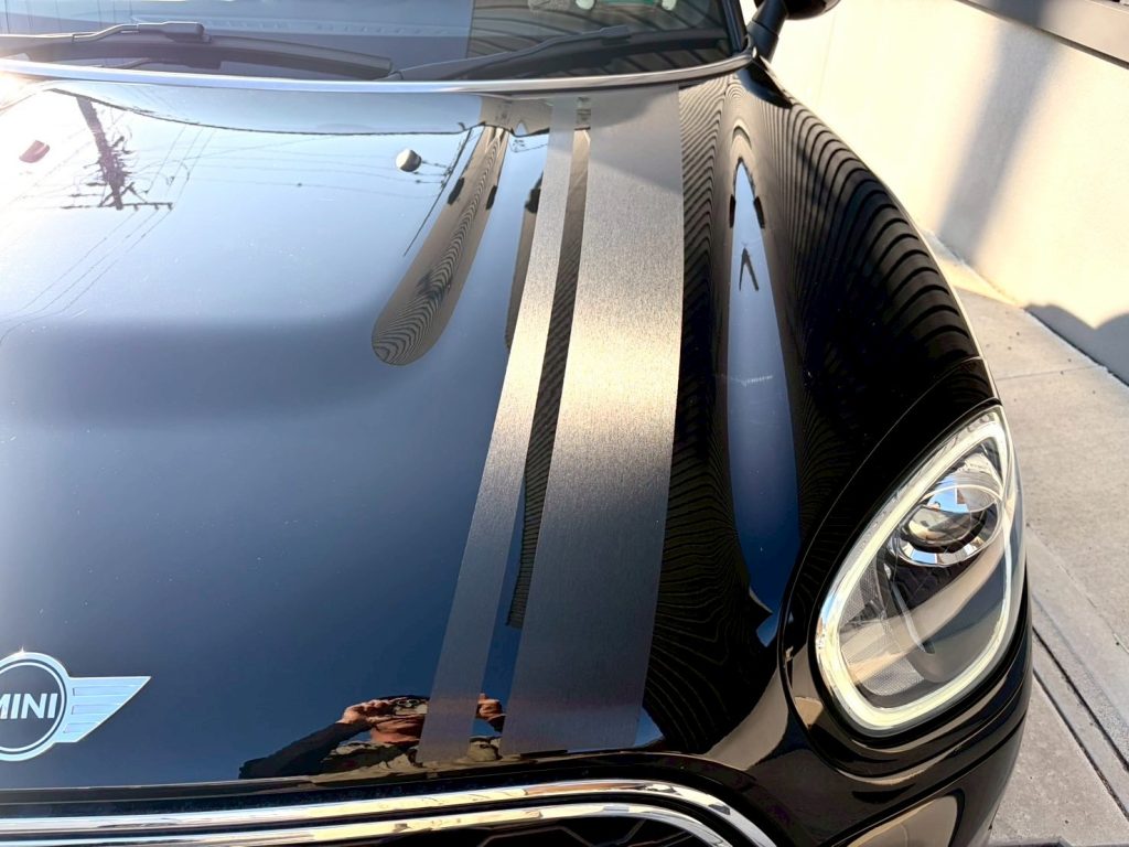今回ご紹介するのは、ブラックボディのMINIに、ヘアライン調シルバーのキースストライプをカーラッピングで貼り替えた一台。